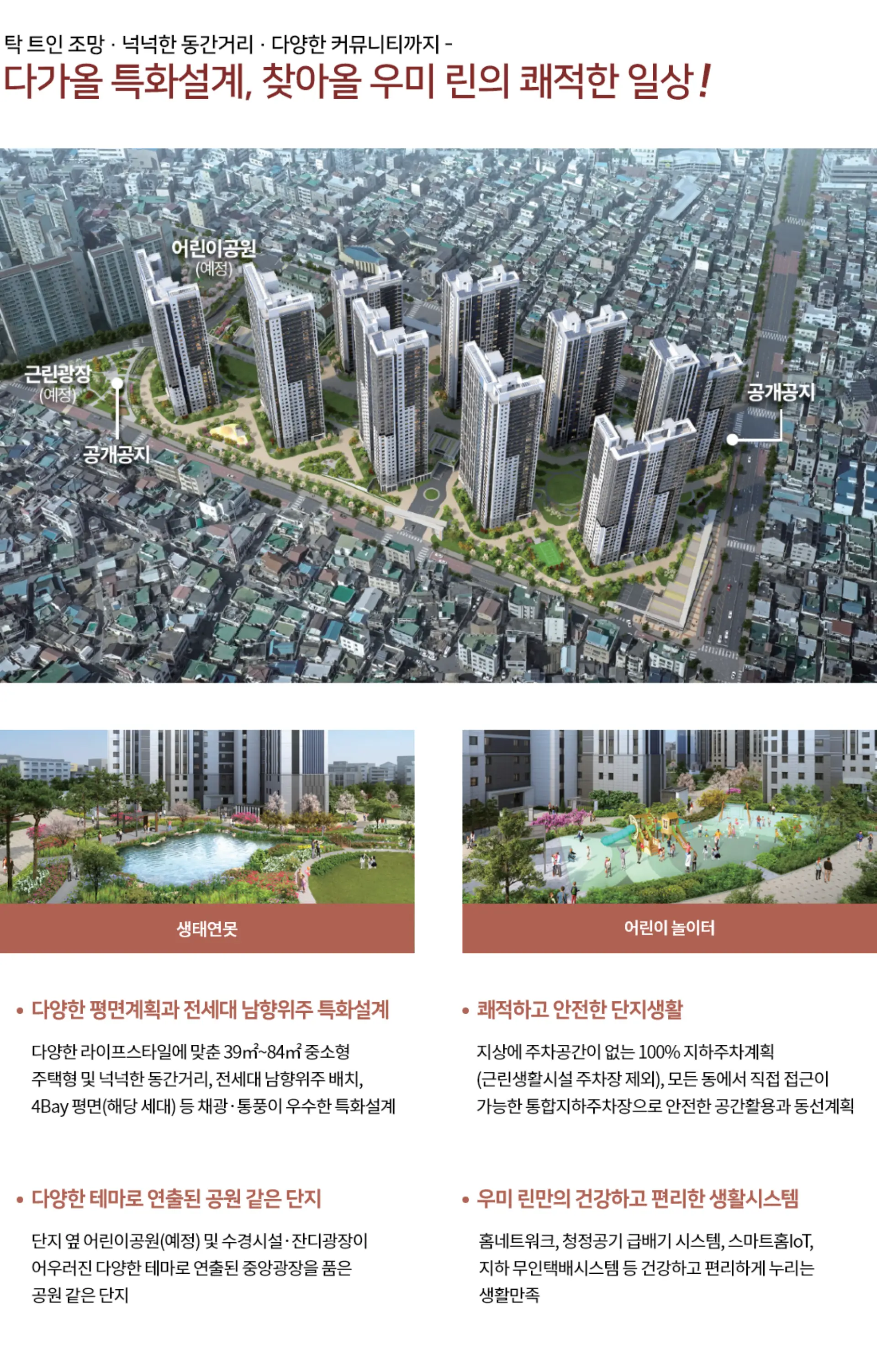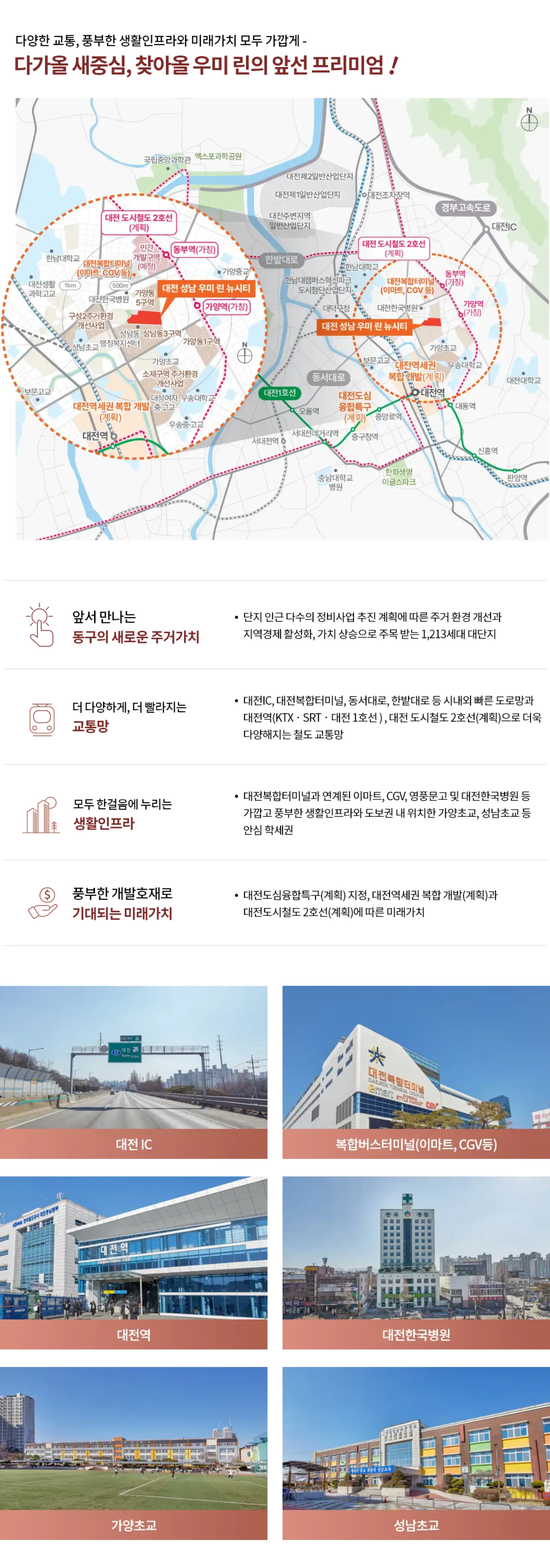 커튼월룩 디자인의 혁신적인 외관 리뉴얼된 건물 외관과 우미린의 테마 조경으로 완성 하이엔드 감성이 돋보이는 커튼월룩 등 차별화된 외관 디자인과 테마별로 조성된 명품 조경이 어우러져 단지의 품격을 높입니다. 대전 성남 1구역 재개발의 시작점 대전 동구 성남동에 새로운 주거 타운을 조성하는 중심 성남동 1구역 주택재개발정비사업을 통해 공급되어 노후된 주변 환경을 개선하고 지역 발전을 선도하는 상징적인 입지입니다. 총 1,213세대, 최고 34층 압도적 규모 대전 동구 스카이라인을 바꾸는 랜드마크 스케일 총 1,213세대의 대단지 규모와 지상 최고 34층의 높이로 지역을 대표하는 주거 랜드마크로서의 가치를 형성합니다. 우미건설이 시공하는 명품 브랜드 타운 전국적으로 검증된 우미린의 시공력과 신뢰도 신뢰의 우미건설이 책임 시공하여 우수한 품질과 높은 주거 만족도를 보장하며 브랜드 프리미엄을 선사합니다. 전 세대 남향 위주 배치로 쾌적성 확보 여유로운 동간 거리와 충분한 채광 및 일조권 전 세대를 남향 위주로 배치하고 여유로운 동간 거리를 확보하여 채광과 통풍이 우수한 쾌적한 주거 환경을 누릴 수 있습니다. KTX/SRT 대전역, 대전IC 완벽한 교통 시내 및 광역으로의 이동이 편리한 초연결망 대전역(KTX/SRT), 대전 IC, 대전복합터미널 등 도시철도와 광역교통망이 집결된 편리한 교통 환경을 갖추고 있습니다. 이마트, CGV 등 풍부한 생활 인프라 가깝고 편리하게 이용 가능한 쇼핑 및 문화 시설 이마트 대전터미널점, CGV 등 쇼핑, 문화 시설이 인접하여 다채로운 생활 편의 시설을 한걸음에 누릴 수 있습니다.